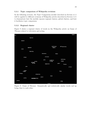 The main contribution of this Master's thesis is a novel way of doing text comparison using word vector representations (word2vec) and dimensionality reduction (t-SNE). This yields a bird’s-eye view of different text sources, including text summaries and their source material, and enables users to explore a text source like a geographical map.